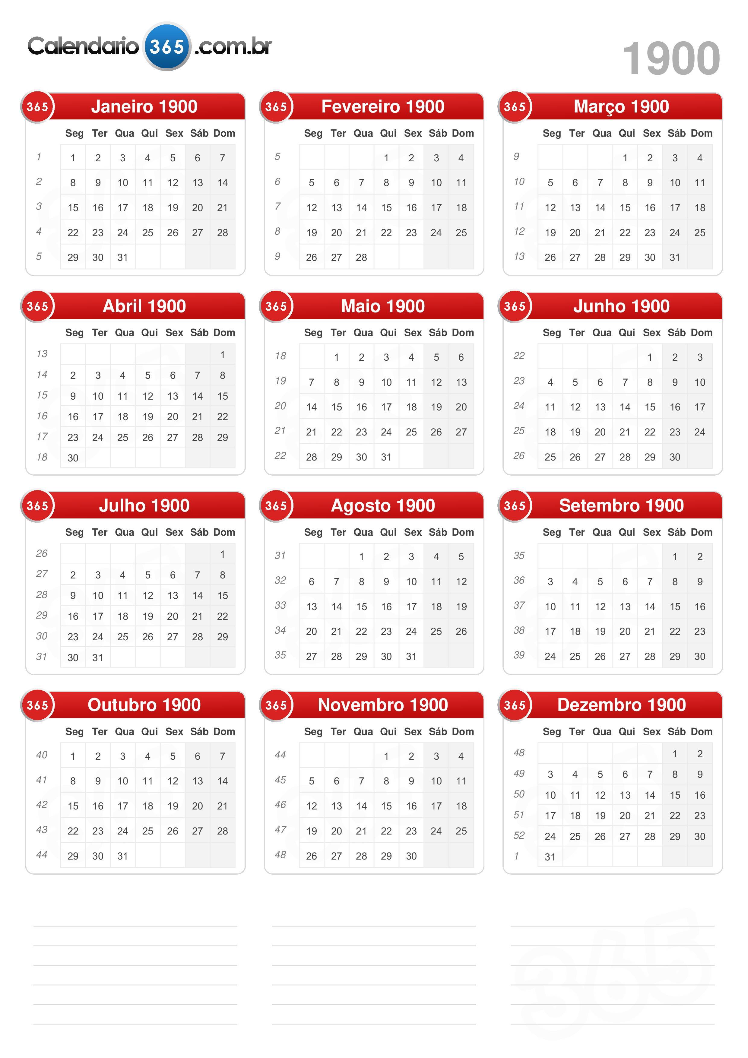 O Calendário 1900 é gerado automaticamente e está sempre online. Também é possível consultar os calendários mensais de 1900 com os números das semanas incluídos. Para tal basta clicar num dos meses acima visualizados. Além disso também pode consultar através do menu visualizado acima nesta página os anos bissextos, as estações do ano, a horario de verão e a horario de inverno, a fase atual da Lua em 1900, o calendário lunar de 1900 e os relógios mundiais.Veja também a Calendário 1901.