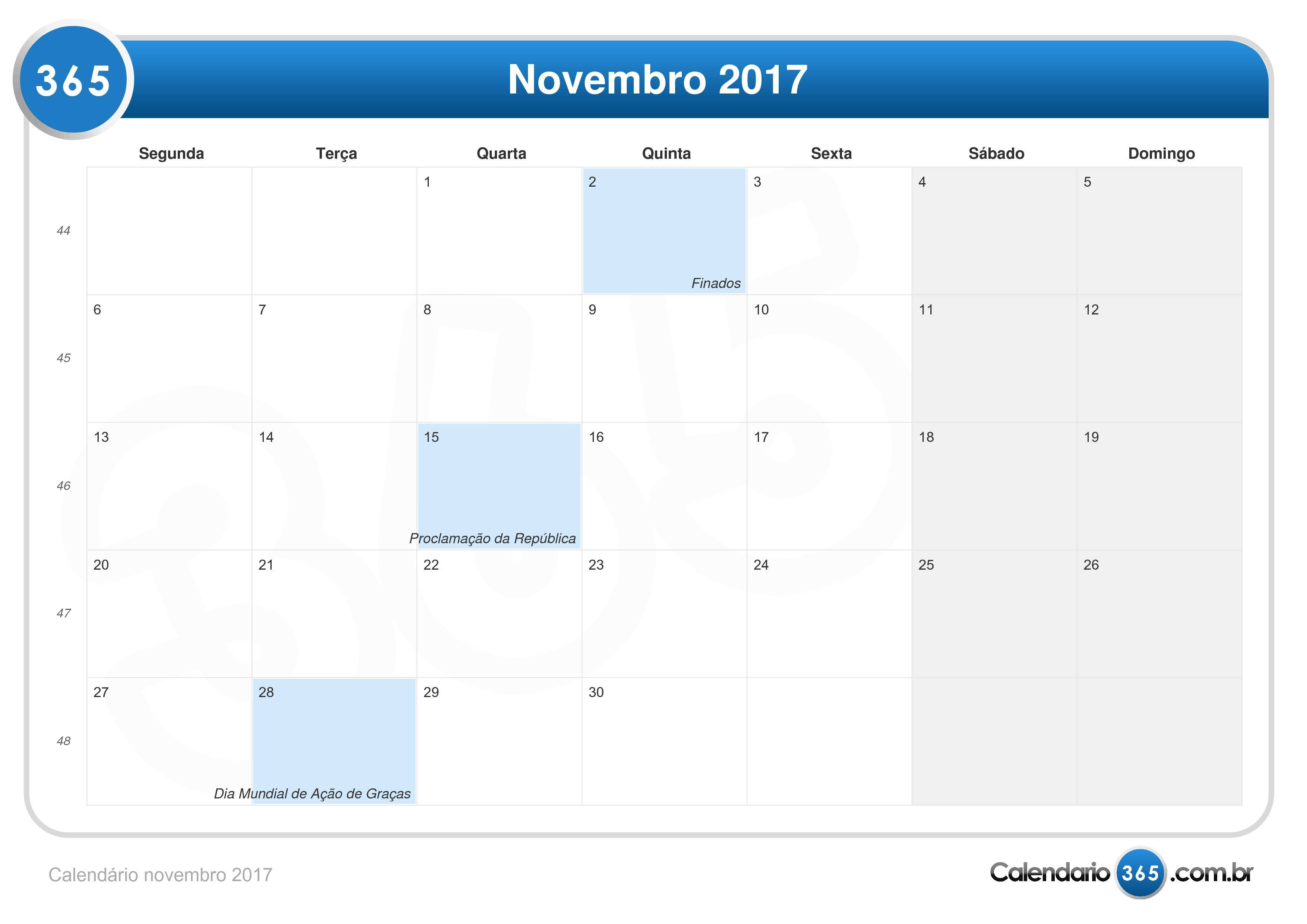 Veja aqui o calendário mensal de novembro 2017 inclusivamente os números das semanas.| Semana | Se | Te | Qu | Qu | Se | Sá | Do |