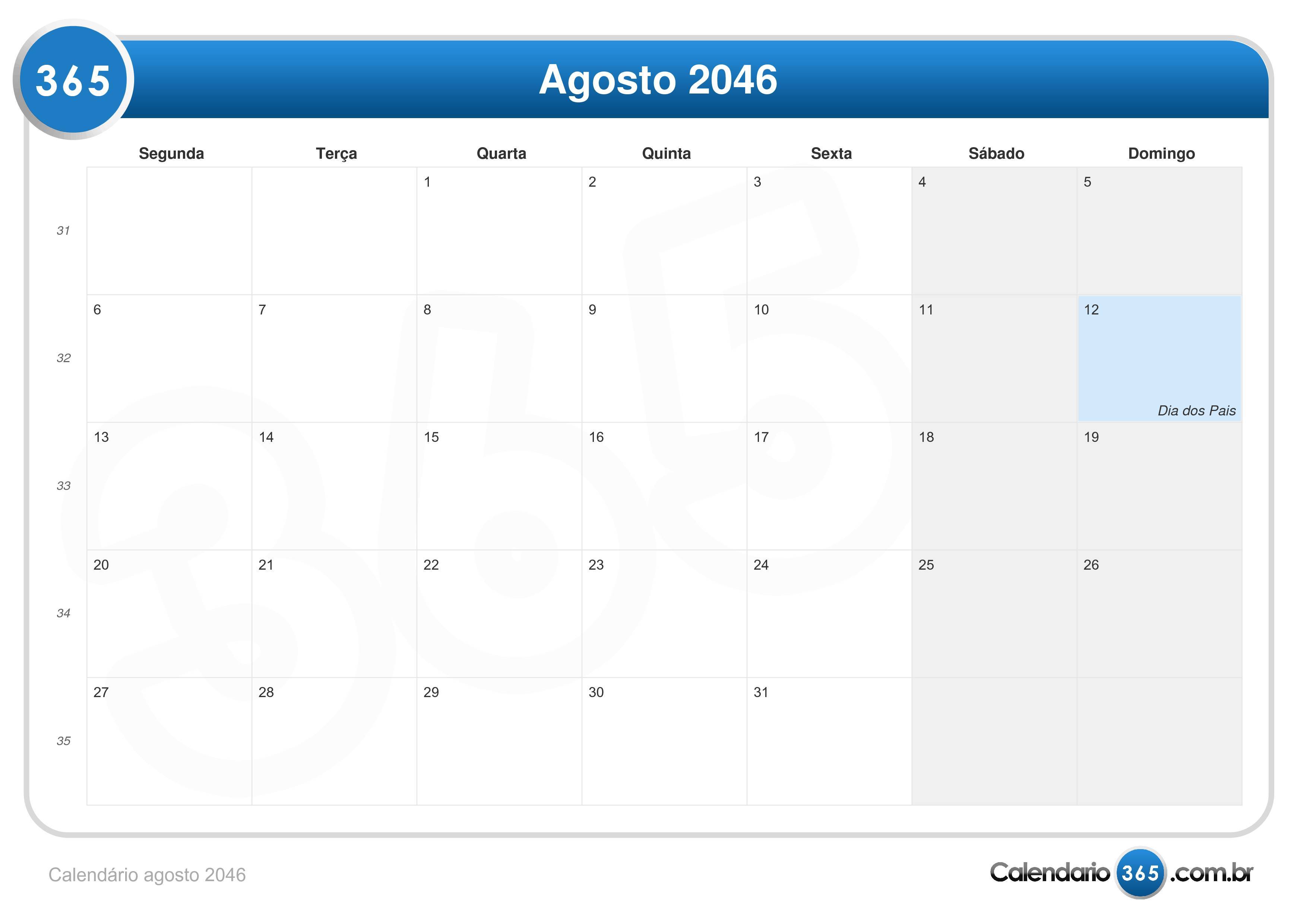 Calendário agosto 2046 (Formato de paisagem)Ir para Calendário 2046.
